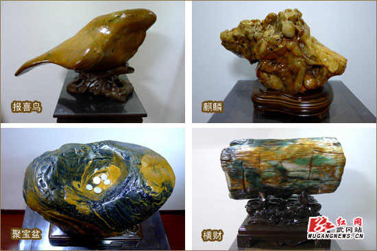 走进“赏心苑石馆”,一股浓浓的文化气息扑面而来。在展出的近百块石头中,有“麒麟”、“黄金山”、“横财”、“聚宝盆”、“熊猫”等,大多造型独特,栩栩如生。其中一块形似“报喜鸟”的石头,曾被中国观赏石协会评为第七届国际奇石节“银奖”。