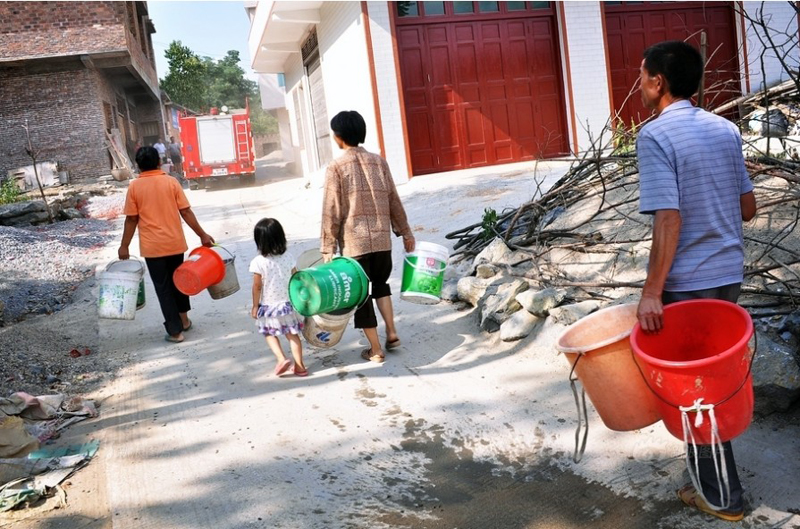 每天下午三点多,排队等水的村民会自觉站在村口,等着那辆送水的消防车。据介绍,目前全市需用供水的有8个村,仅一辆载水量5吨的消防车轮流送水。有的地方还得跑两趟。