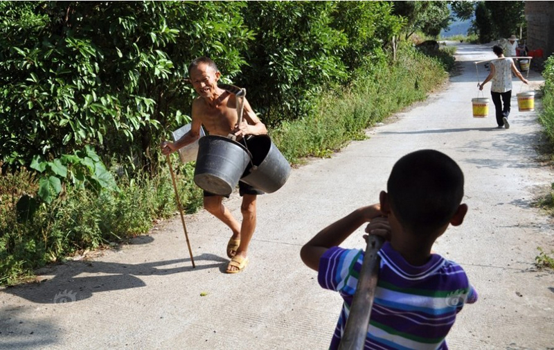 在帮着小磊抬水往前走的时候,一位老村民挑着四个空水桶快步走过,因为马上就能接到水了,他脸上露出了笑容。摄影|李健/三湘都市报
