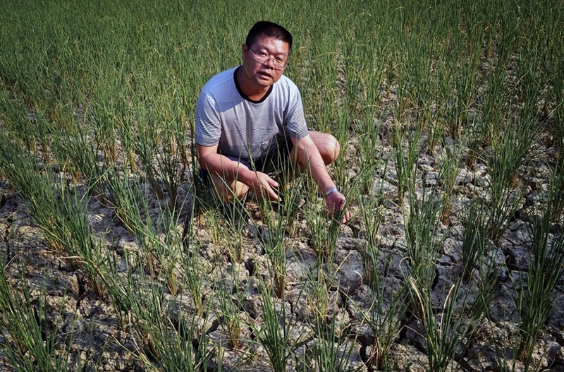 二伏天,稻田脱水、大地开裂。