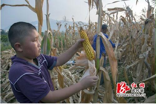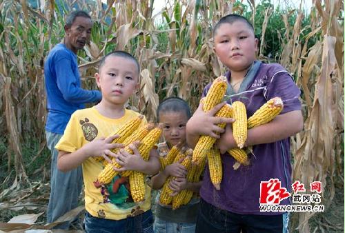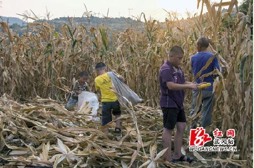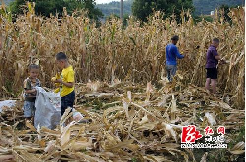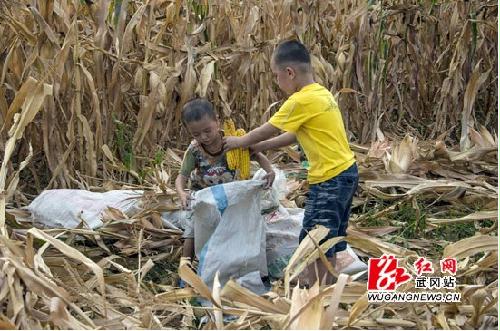 8月13日,武冈市龙溪乡南山村1组的小朋友文彦博、文子涵、陆泽运冒着高温帮爷爷收玉米。他们仨人的爸妈长期在外务工,兄弟们从小跟着爷爷奶奶生活。今年是大旱之年,他们要帮助家里提水,送水,浇地,还要帮助抢收玉米。