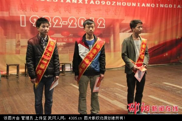 据悉,截至3月31日,该校本学期已组织青年志愿者给辕敬老院的老人们送温暖一次,建立定点社区服务基地一个,上街义务宣传一次;有十个班级专门组织了义务劳动,有五十一个班级组织了“学雷锋,献爱心,捐献压岁钱”活动。全校拾物不昧、拾金不昧现象更是层出不穷,其中该校366班黄晓明、杨康、周立鑫三名同学拾到现金两万元交还失主的事迹经邵阳新闻在线和武冈新闻网报道后,便迅速为网易、新浪、红网等十一家大小媒体所转载。