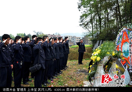 在庄严肃穆的气氛中,民警们一一走到杨明洪墓前,怀着崇敬的心情,敬献鲜花,鞠躬默哀。