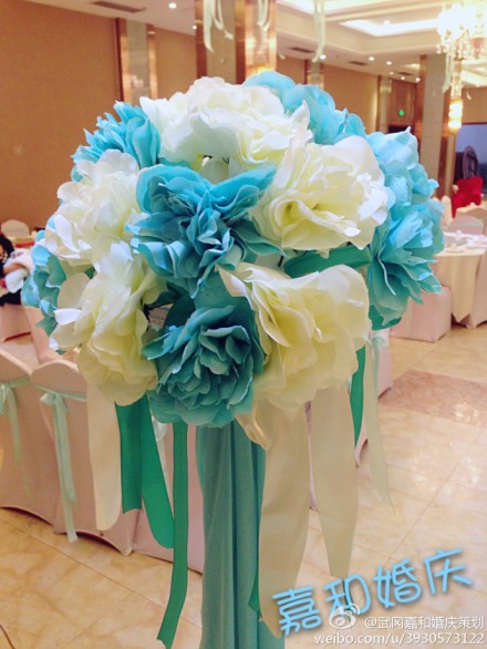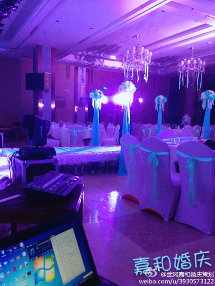 武冈大酒店五楼宴会厅正在策划婚庆,婚庆的现场布置的很美观,有许多漂亮的颜色,也有人正在精心布置婚礼。