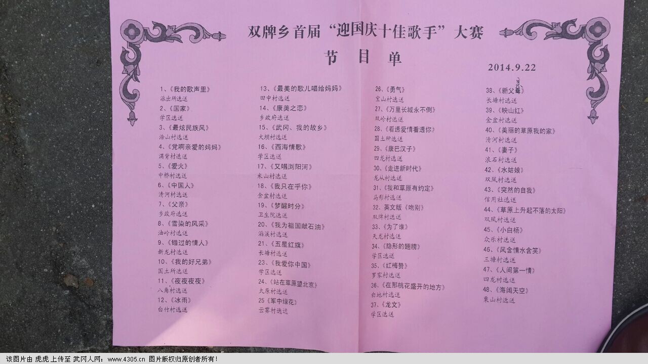 人网简讯9月22日,武冈双牌乡首届“迎国庆十佳歌手”大赛。此次大赛由双牌乡党委,双牌乡人民政府主办,乡文体卫,乡计生协会承办。节目由乡各单位和各自然村选送,共48首歌曲。