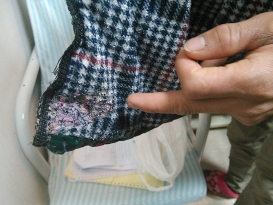 “我家婆的衣服不小心沾到一点(白沫),当时就被烧了一个洞,我家婆一看不对,赶紧让我打车送他来医院。”易女士曾试图询问小泽到底喝了什么,但小泽却说不出个所以然来。送院期间,小泽还几次呕吐,吐出的液体碰到衣服后,衣服的纹路立即被腐蚀得模糊不清,令人心惊。