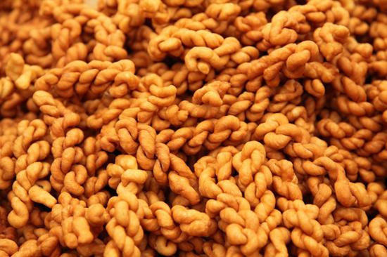 过年必不可少的还有炸“泥嘎子”。这个东西有点像麻花,但是却比麻花要好吃得多。面粉加上鸡蛋加上适量的水,活匀后,揉成面团,这时候就全家出动,发挥想象,做成很多很多的形状,有蝴蝶、小鸟、还有花,巧手的还可以做成孔雀,又好吃又好看还好玩,是小朋友们最喜欢的年前节目之一,做好后放在油里炸得金黄,吃起来香脆酥口。不过现在很少有人家自己动手做了,都在店子里买,味道还好,就是没了那些多姿多彩的形状了。