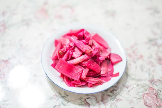 这是我很喜欢吃的食品之一,也是过年才有的,叫“红姜老蒜”,里面有大蒜、姜、萝卜,加上可食用的植物红色素,寓意着红红火火,欢欢喜喜过大年,武冈的“红姜老蒜”经过特殊的工艺,酸爽可口,下饭一绝。