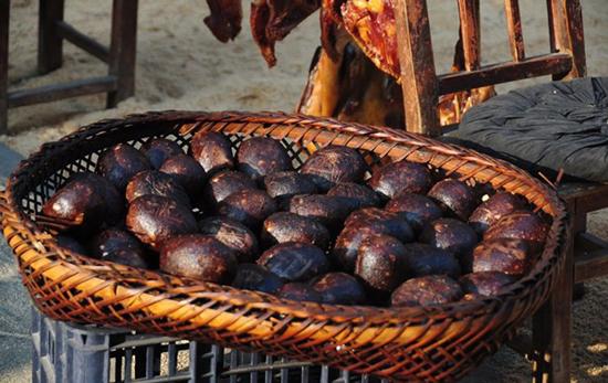 猪血饼是用猪血、压干水份的新鲜豆腐和斫碎的去皮五花肉,捣碎揉烂,做成厚饼,再以烟火曛制而成。过年的时候,各家各户的大嫂子、大婶子们面绽得意的笑,一个个来去匆匆地大显身手。街头巷尾,随处可见架有木渣火盆、烘箱。那一片片袅袅的烟雾,飘出人们的欢笑。猪血饼在邵阳也有,但我总觉得武冈的猪血饼较之邵阳的要软嫩可口得多。