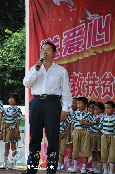 通过武冈市经管局驻村“第一书记”张祖标等人的牵线搭桥,邵商会常务主席、湖南兆富投资控股集团董事长、株洲市邵阳商会会长廖斌先生将武冈奖教助学的第二站设在了栗山村小。当天上午, 当廖斌率领助学团一来到栗山村小,就受到了当地村民和学校师生的夹道欢迎。随后,廖斌还与广大群众一道饶有兴致地观看了丰富多彩的庆“六一”文艺演出。