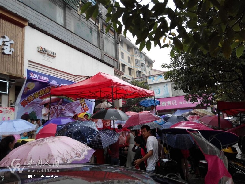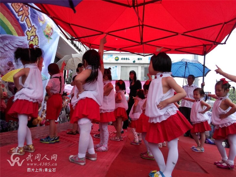 今天上午,武冈城里的雨一直淅淅沥沥地下着,但是,在武冈步行行街元元蛋糕店门前临时搭建的舞台上,一群天真可爱的小宝贝们正在为庆祝六一儿童节进行文艺汇演。偏偏天公不作美,天空一直下着小雨。但旁边围观的家长和路过的人们却撑着雨伞,全神贯注地观看舞台上的“小主角”们,热情丝毫没有受到细雨的影响。这不,你看,现在跳着的就是那首非常熟悉的《小苹果》,不过是小宝贝版本的。