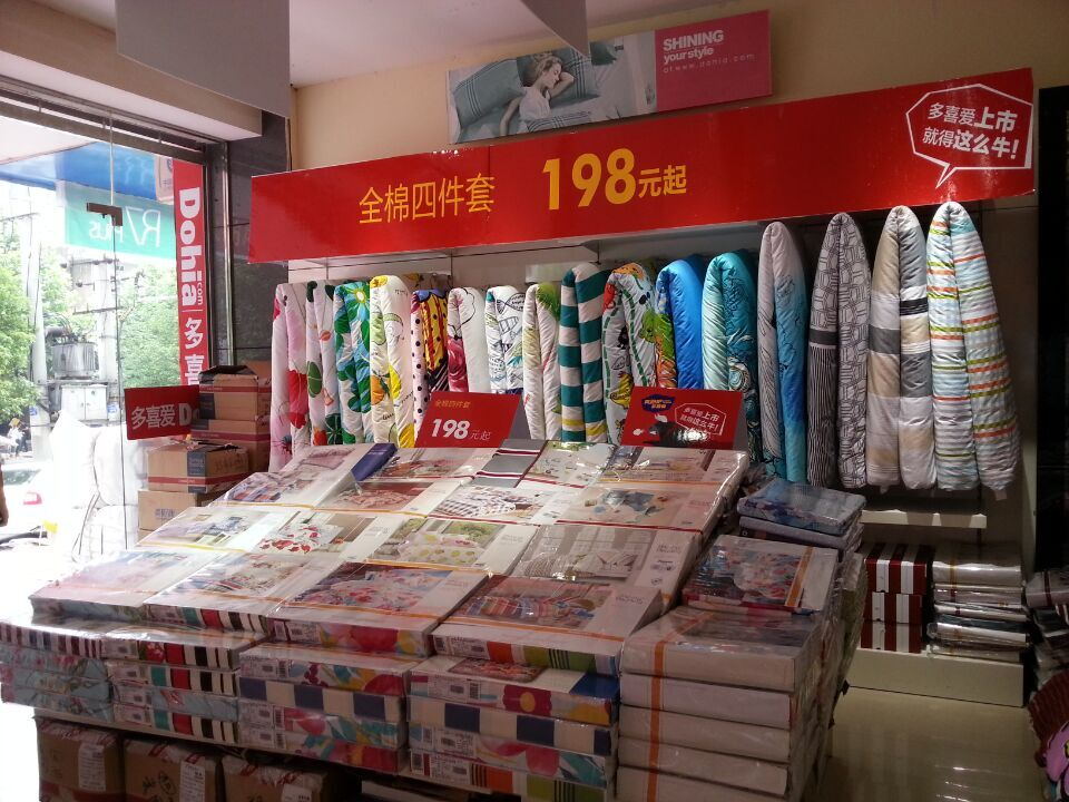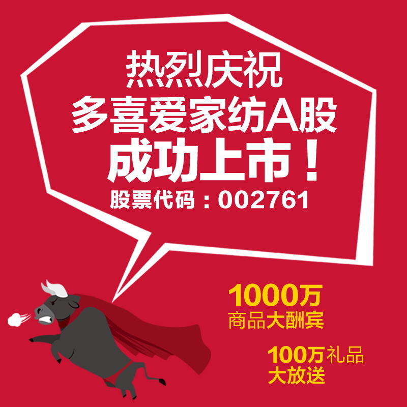 多喜爱家纺股份有限公司,成立于1999年。注册品牌为“Dohia多喜爱”。该公司主要从事以套件类产品(含枕套、被套、床单、床笠等)、芯类产品(含枕芯、被芯)为主的家纺用品的研发设计、委托加工的组织、品牌推广、渠道建设和销售等业务,并一直致力于新材料面料的应用研发和生产业务;公司营销中心设在湖南长沙,开发中心及生产企业等在广东省深圳市、东莞市。公司拥有销售网点千余家,遍及全国各地,是行业内发展速度最快的企业之一。