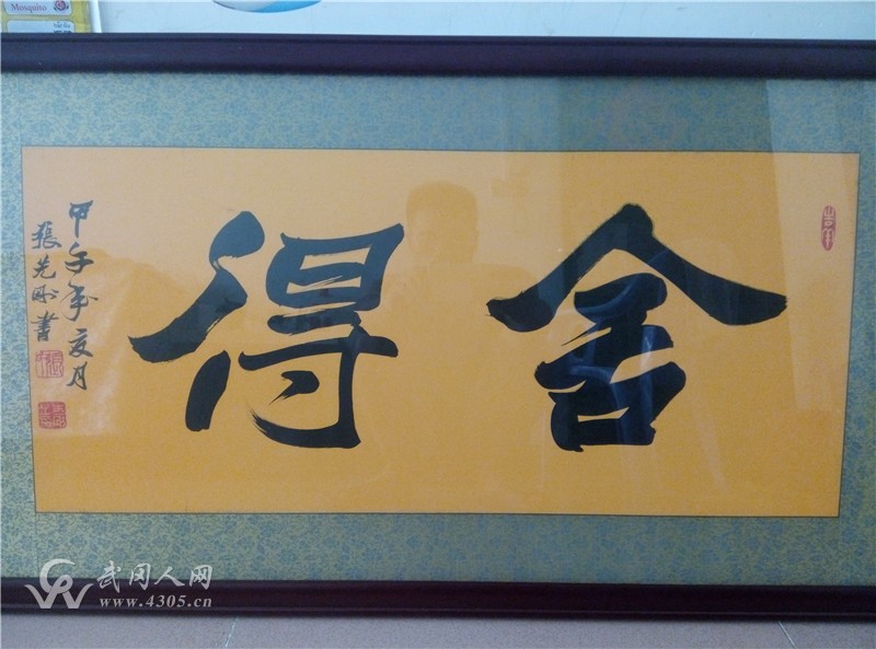 舍得【题材】水墨书法已裱框<br/>【材质】佛教黄描龙宣纸<br/>【尺寸】68*34