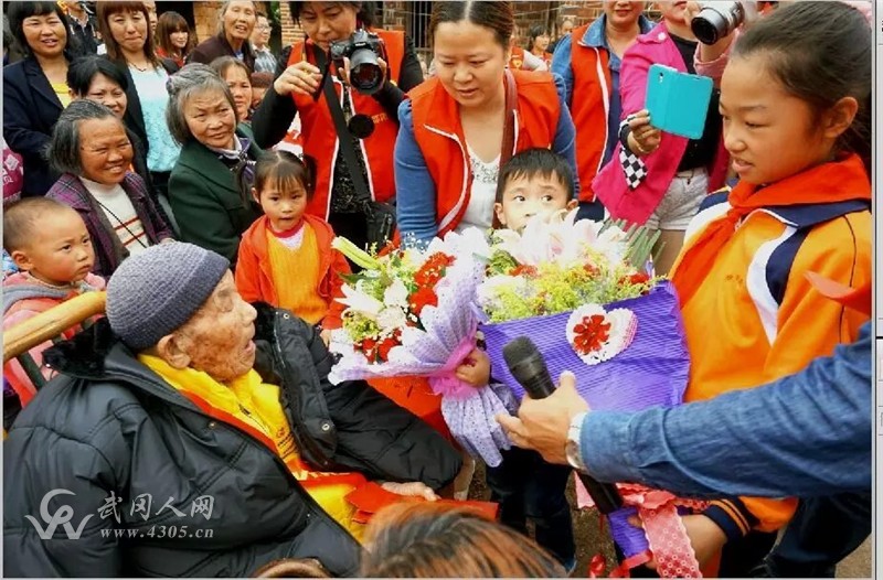龚亲龙老人生前与志愿者欢度百岁寿辰