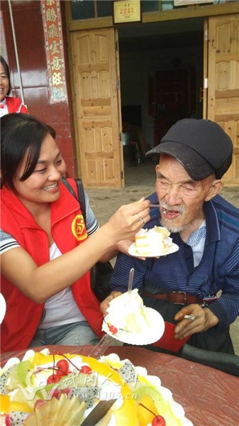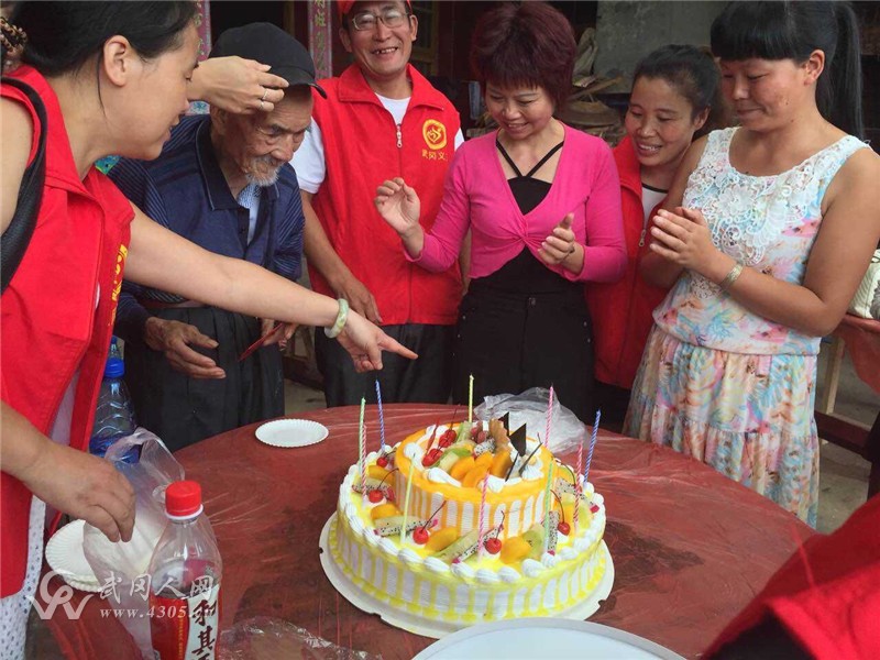 载着肖武娣女士等20余名爱心志愿者的车队一到达毛立斌爷爷家里,大家就迅速下车精心准备老寿星的生日聚会,有的帮忙洗菜、切菜,有的陪老人聊天,还有的摆设桌椅,毛老家的小院就像过年一样热闹。随后的祝寿现场,志愿者们为毛立斌点上了大蛋糕上的生日蜡烛,齐唱《祝你生日快乐》,并奉上募集到的生日礼金。在阵阵祝福声中,毛老与肖武娣女士共同吹灭蜡烛,激动得热泪盈眶。他说,尽管平生第一次吃生日蛋糕,但是有各位爱心人士陪伴,真的很开心。