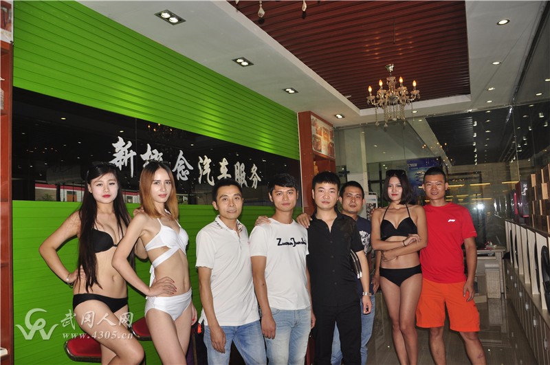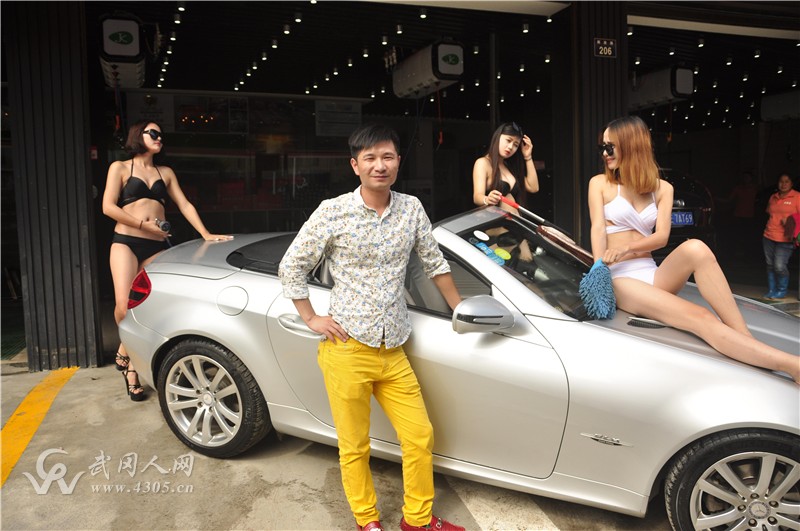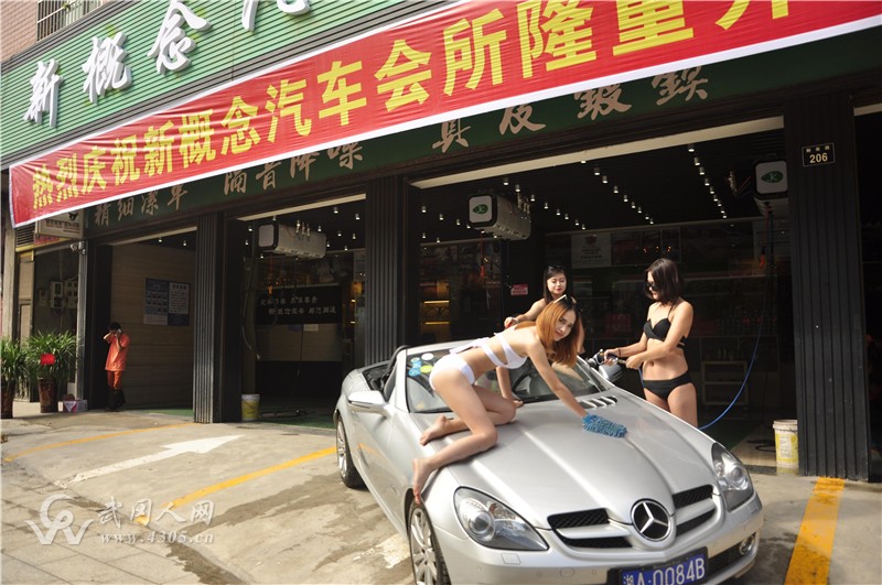 新概念汽车会所开业了,现场模特美女穿比基尼为顾客洗车。