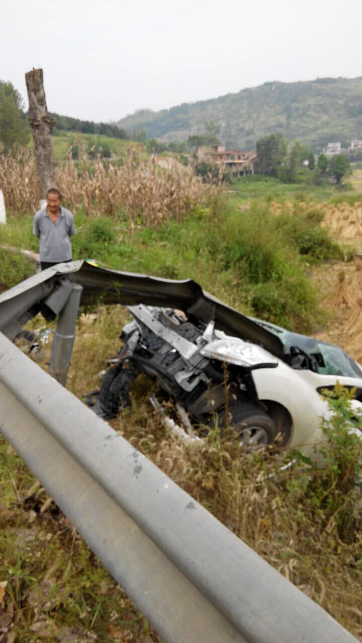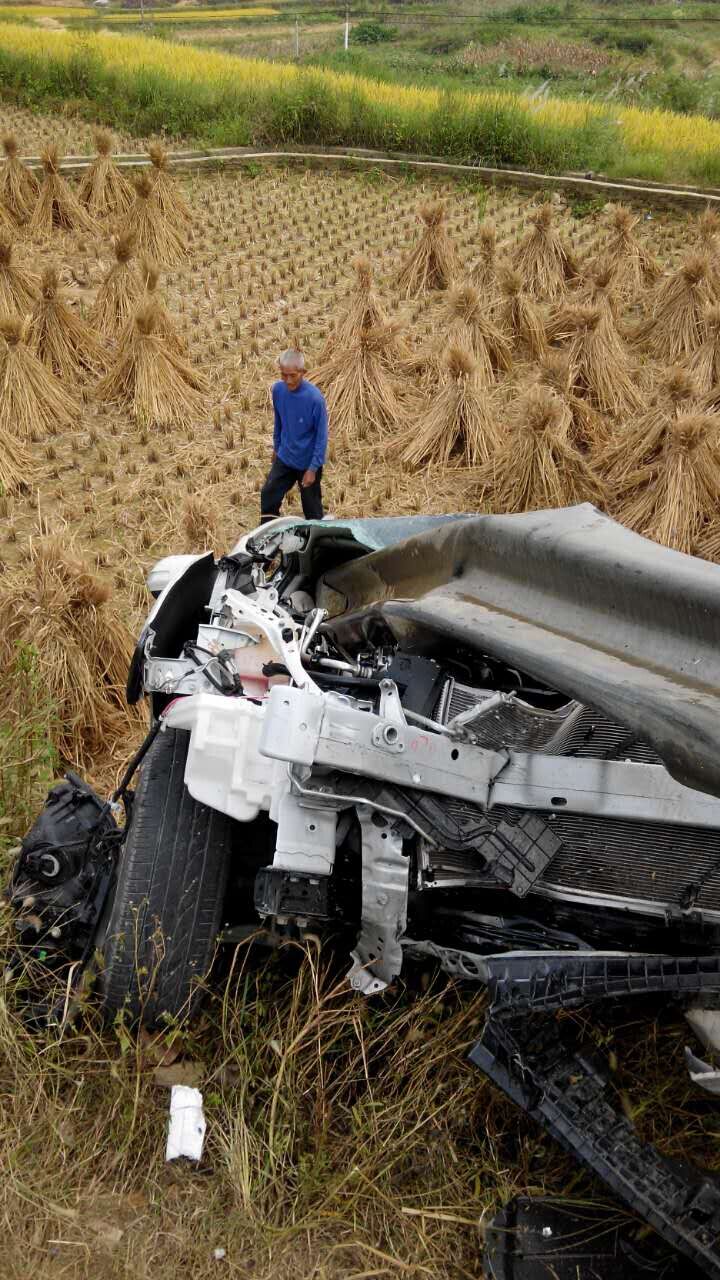 武冈某路段今晨一新车撞护栏翻稻田,惨!