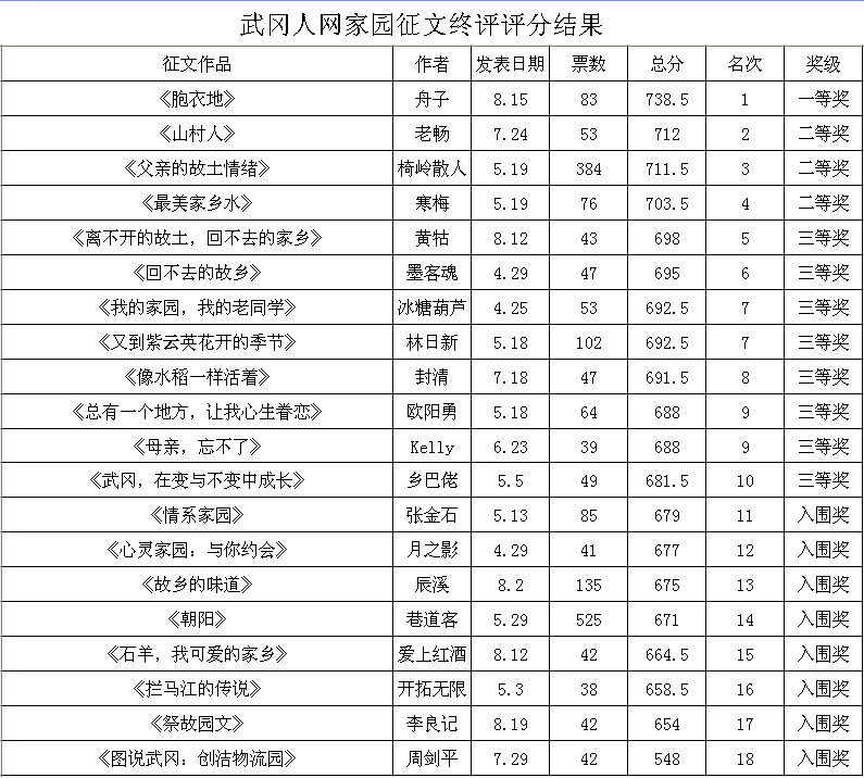 恭喜得奖的老乡们!评委老师们辛苦了!这个名单,应该也是绝大多数老乡们所喜闻乐见的吧!所有入围文章俺都仔细地看过几遍,并投了票(只有周剑平老师的《图说武冈:创洁物流园--我的家园》没有投票,不是不好,只是个人以为商业味浓了点)。这个获奖名单结果,和俺心里的出入不大,只有张金石先生的《情系家园》没有高中,略感意外(不过,看了评委老师们的评分表,感觉也在情理之中——只差了那么一丁点了)。个人以为,要每个评委老师公布自己的评分,不会有些勉为其难了吧?萝卜白菜,各有所好,略有差异,也在情理之中啊!