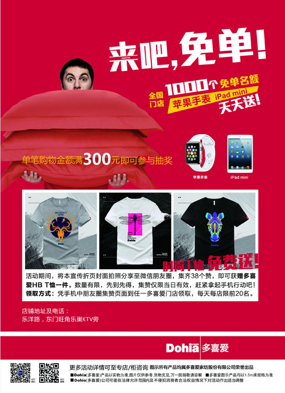 转发此图片集赞将本宣传折页拍照分享至微信朋友圈,集齐38个赞,即可获赠多喜爱HB限量版T恤一件。数量有限,先到先得,集赞当天有效(9.29—10.8),领取方式:凭手机中朋友圈集赞页面到武冈多喜爱专卖店领取,赶快拿起手机,快快行动吧!