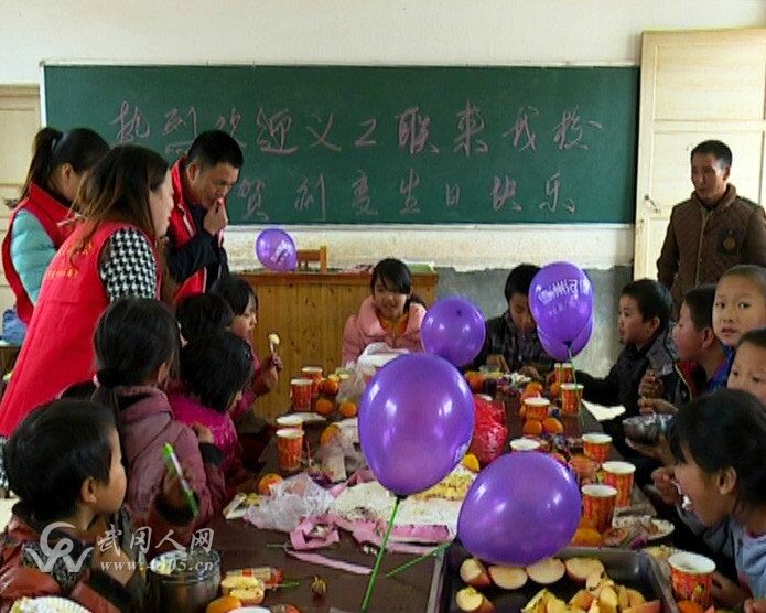 11月26日是刘变的10岁生日,对于家庭贫困的刘变来说,这个日子和往常一样。然而,义工们的到来却改变了这一切。义工联合会为她准备了生日礼物,有新衣服、新鞋子、文具书本、糖果,还有爱心人士捐赠的生日蛋糕、鸡腿。生日patty就放在刘变上课的教室里,刘变在义工和同学们的共同陪伴下,第一次过了一个热热闹闹的生日,脸上洋溢着纯真、幸福的笑容。