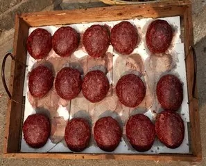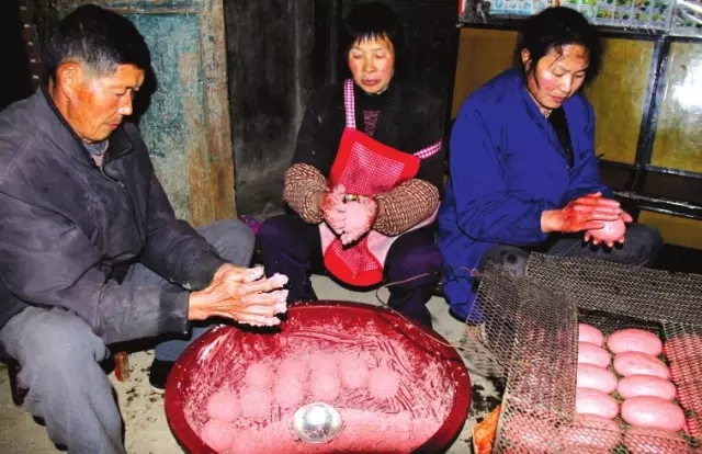 也有做一铁架,架下用火炉焚烧锯木屑、糠皮、谷壳或木炭熏烤,此种熏法特别讲究火候,不能过急过猛,否则口味不佳。丸子熏干后即可食用。猪血丸子色、香、味俱佳,腊辣可口,增进食欲,且易于保藏,至少半年内不会变质,同时还携带方便,煮熟切成片即可食用,是宴客时一道开