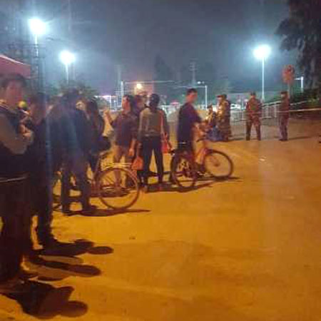 工人们逗留在事故现场周围观望