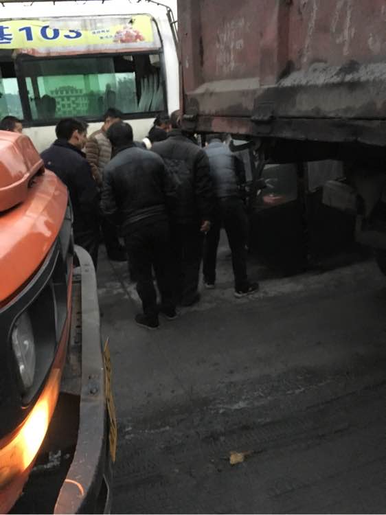 武冈龙溪镇龙云村附近一起交通事故,具体事故不明,因三轮车准备超客车没有超越,便夹在客车与货车之间,三轮车前轮和车头已经散架,三轮车驾驶员已送往医院,目前伤势不明。