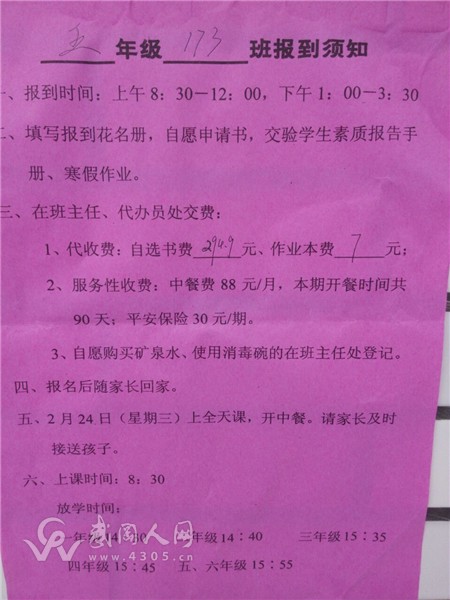 网友“语过清空”反映:他小孩在红星小学读五年级,需要上交的费用是:一、代收费:1、自选书费294.9元,作业本费7元;二、服务性收费:1、中餐费88元/月,本期开餐时间共90天;2、平安保险30元/期。三、自愿购买矿泉水、使用消毒碗筷的在班主任登记。