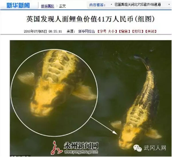 据悉,人面鲤鱼极其稀有,英国一拥有人面鲤鱼的主人曾给他的鱼报价4万英镑,约合人民币41万。(永州新闻网讯刘泽荣)
