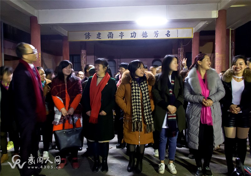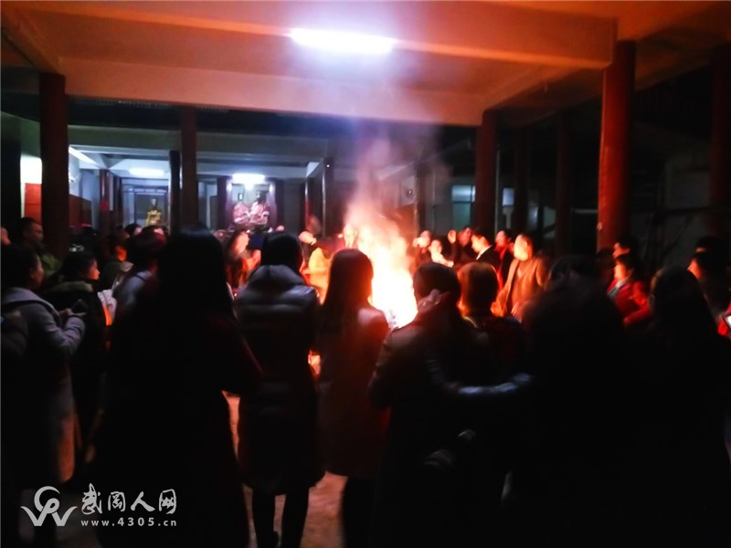 为了迎接新一年的到来,2017、12、25号由《结交新朋友》户外群和《阳光商会资源共享》群共同组织的,在武冈南天庙举行"辞旧迎新、放飞希望"篝火晚会。 晚会下午2点开始,共有70多人参加,首先举行登山活动,下山后,大家在南天庙吃过晚餐,晚上6点钟正式举行篝火晚会。晚会开始由邓先生至辞!男、女主持人分别宣读篝火晚会内容和节目。晚会节目多姿多彩,有喜从天降,红包飞来、小鸡舞、花鼓戏、真心话冒险、兔子舞、坐气球、旗袍美女表演的太湖美、美丽的蒙古包舞。节目结束并给优胜者颁发了奖励。 通明照耀南天庙,篝火未尽歌正甜,友谊共婵娟,相识今夜牵手手聚一圈。9点钟晚会在一曲难忘今宵中圆满结束。