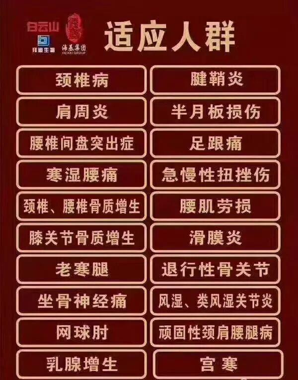 颈椎病;腱鞘炎;肩周炎;半月板损伤;腰椎间盘突出症;足跟痛;寒湿腰痛;急慢性扭挫伤;颈椎、腰椎骨质增生腰肌劳损;膝关节骨质增生;滑膜炎;老寒腿;退行性骨关节;坐骨神经痛;风湿、类风湿关节炎;网球肘;顽固性颈肩腰腿病;乳腺增生;宫寒;痛经。