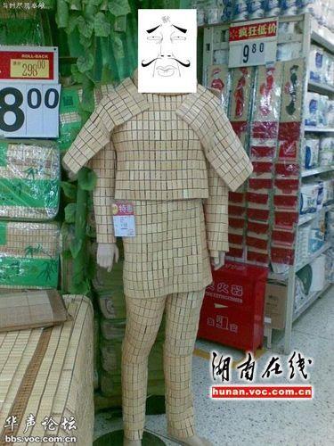 网友提供的图片里,一男模特全身裹满了各式凉席用品,头戴水盆,鼻子上挎着墨镜,胸前别着玩具枪,网友笑称其为“凉席版兵马俑”。甚至有网友在论坛里玩起了恶作剧,用图片处理器将“兵马俑”的头部改成了古典人物的模样。