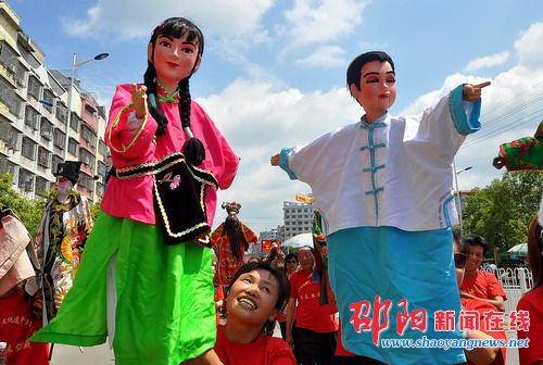 上午9时许,由邵阳学院带来的龙狮表演拉开了非物质文化遗产展演的序幕。随即,来自各县市的代表性非遗项目表演依次登台,赢得了现场观众阵阵热烈掌声。邵东杖头木偶戏灵动传神,展示出这门艺术绝活的无穷魅力;原始古朴的呜哇山歌和亮丽多彩的花瑶服饰表演,反映出浓郁的花瑶风情;洞口县的棕包脑,让观众领略到了当地瑶族同胞独特的民俗风情和祭祀礼仪;邵阳县的蓝印花布模特方阵表演清爽而不失华丽,将蓝印花布印染技艺展现得淋漓尽致;武冈丝弦婉约清新、绥宁侗琵琶弹唱表演浪漫别致、新宁县“岩鹰拳”表演刚柔并济,令现场观众看得如痴如醉。尤其是当独具特色的城步苗族自治县“下团吊龙”出场时,那精致美观的扎制工艺,别具匠心的“吊龙”技法以及舞龙者灵活快捷的步伐,无不让人惊叹中华民间文化的精彩绝伦,赢得全场观众雷鸣般的掌声。随后,邵阳县白仓高跷及扎故事、武冈石羊走马灯等11个非物质文化遗产项目及8个代表队方阵参加了巡游展示活动,让观众大饱了眼福。