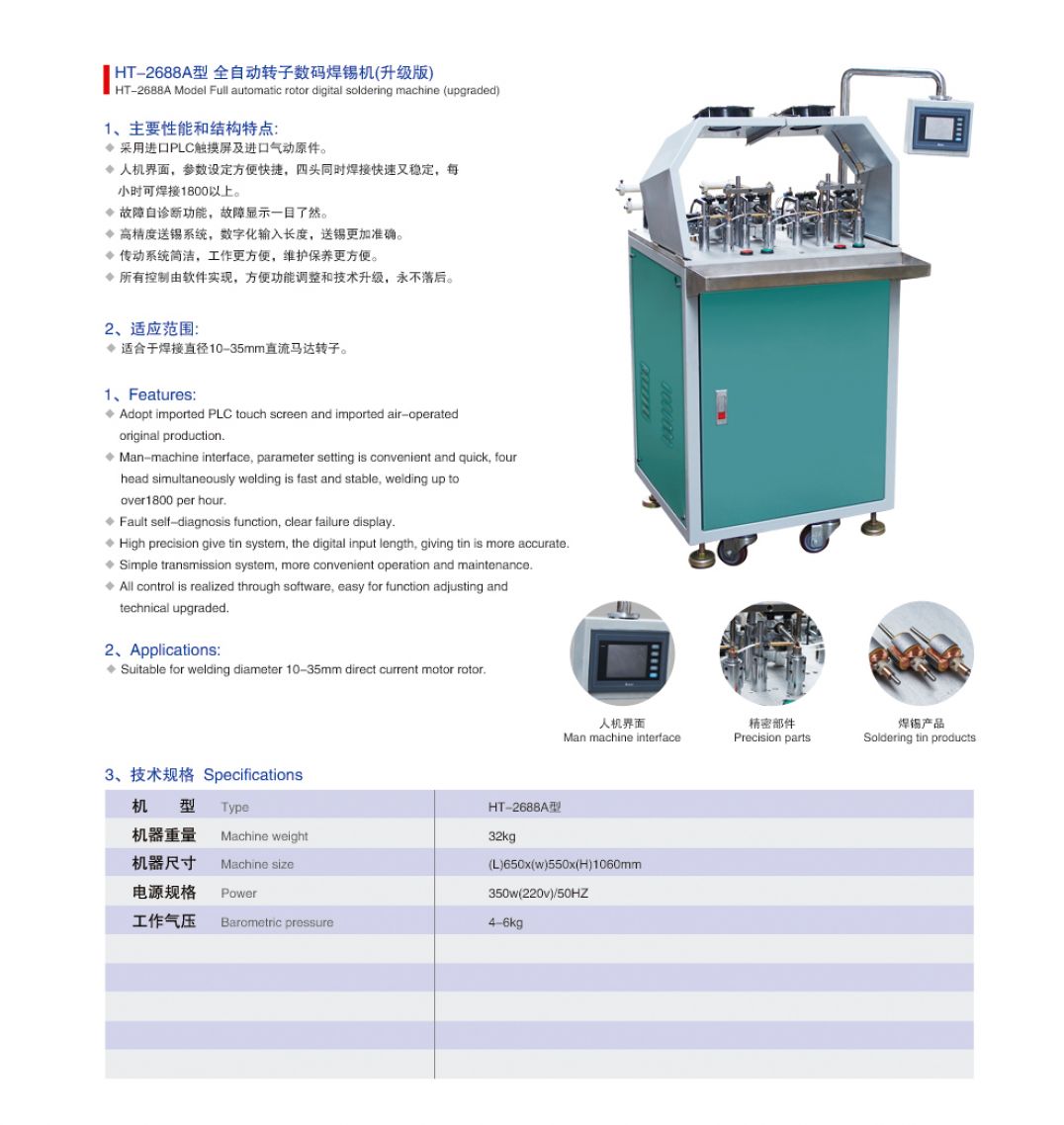 本公司成立多年来致力技术创新,市场的开拓和满足广大客户的需求,经不断试验及改进,成功研制出HT2688-A4、HT2688-A6、HT2688-A8全自动绕线机、HT-2688A型自动点锡机,获得多项专利。该系列绕线机广泛适应于:玩具马达、小家电马达、汽车马达、电动工具马达等各类微电机转子的高品质绕线。该绕线机结构新颖、工作可靠、操作方便、各项技术指标、性能指标均可与国内外同类机型相媲美。