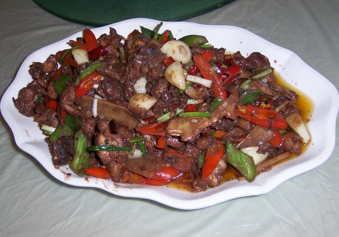 血浆鸭,是一种特殊烹调出的炒鸭。做血浆鸭一要白醋调鸭血;二要火力猛;三要佐料齐。三斤重的仔鸭,得半斤仔姜、半斤嫩红辣椒、半斤槽头肉、一两甜酱(一种特制的麦酱)。刀法也很有讲究,鸭要切小块,姜要切成草纸般薄,辣椒要选肉质厚的,切成宽丝形。槽头肉就是猪脖子杀口边的肉,它油而不腻,稍煎则油出,而肉不会成油渣。鸭肉爆炒到断了血色后,就加盖焖,不能放丁点水,待鸭肉的水份焖干了再加辣椒、姜片和盐翻炒,视辣椒半熟时,即将绊了甜酱的醋血倒入,猛火翻炒,将血绊匀成酱色即成。