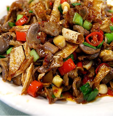 武冈的板鸭是风干而不是曛干的,所以水分虽没有了,却仍保持肉质的厚实和嫩软,而且色泽如腊,浅白浅黄,十分诱人。威溪冲的冬笋嫩而肥,甜净得爱人。我一直以为用它来炒咸分重的板鸭,既可吸去油腻,又可冲淡咸味,使它肥而不腻,咸淡适中是情理中的事。只是弄不明白的何以用同样料的各家酒馆的冬笋炒板鸭,就出不来五湖春的味儿?