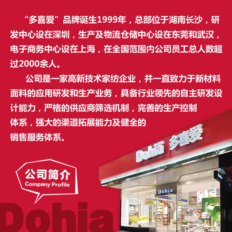 多喜爱家纺股份有限公司,成立于1999年。注册品牌为“Dohia多喜爱”。该公司主要从事以套件类产品(含枕套、被套、床单、床笠等)、芯类产品(含枕芯、被芯)为主的家纺用品的研发设计、委托加工的组织、品牌推广、渠道建设和销售等业务,并一直致力于新材料面料的应用研发和生产业务;公司营销中心设在湖南长沙,开发中心及生产企业等在广东省深圳市、东莞市。公司拥有销售网点千余家,遍及全国各地,是行业内发展速度最快的企业之一。