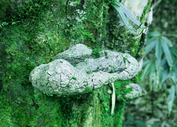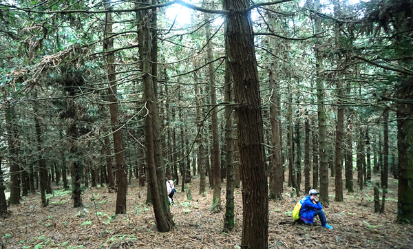 补充能量后,我们开始了穿越之行,沿金童山一千七百多米的山脊,从苔藓区走约一小时后,路的痕迹已淡。沿途见到很多珍稀物种,植物如冷杉、红豆杉、伯乐树、五针松、三尖杉、半枫荷、黄连等野生资源。林里鸟声不断,这里是鸟类的“天堂”,省鸟“相思鸟”的聚集地。在一只巨型古树上,竟发现了三个硕大的灵芝,年久没人采,底部已长满青苔。