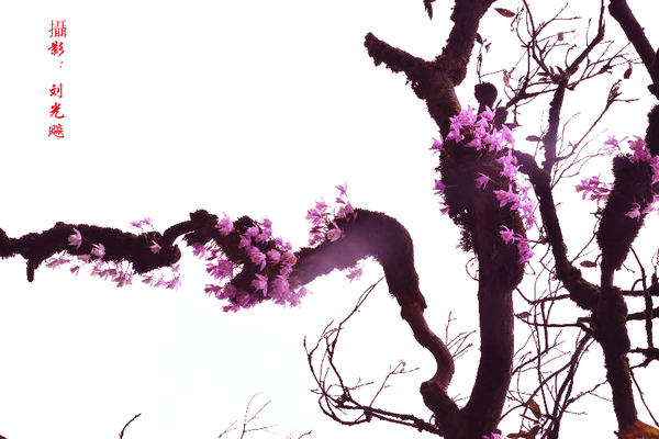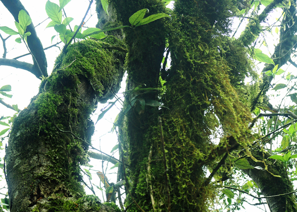 过了地面苔藓区,进入水青冈古树林,我们运气极佳,竟见证了极为罕见的枯树开花奇观,山谷里数百亩水青冈,树叶还未冒头,树干、树梢上都长满着厚厚的苔藓,苔藓上绽放着艳丽的寄生独兰,整个山谷里亮丽一片,独兰上树世之罕见。