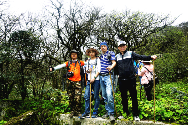 金童山保存着湖南最大面积的原生态水青冈树种群。这里古树树龄都在百年以上,春末梢头未吐新芽,不细看还以为是枯树,苍老的树干、树梢千奇百态,扭曲变形,气势雄浑。它们和高山杜鹃混合一起,点缀着,你看那树形,形态各异,有的象人形,有的象动物,有的象英文汉字,千姿百态,树梢上的苔藓往下长得老长,胜似爷爷的美鬓,更象山羊的胡须。美女们、五名孩子欢呼着、跳跃着,那兴奋的劲儿,让人舒心,孩子们脸上的笑容,与晚春的时节融合在一起,笑声、震憾声,清脆悦耳,放大喉咙的欢歌声,响彻山谷。
