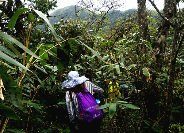 一人多高的矮竹里,伴有许多针刺,大家手脚并用,时不时被竹枝、茅草划伤手脚,稍不留神,前滑一屁股坐在烂叶地,后滑摔得满脸啃泥,没有登山杖或不手拉着竹子,稍不溜神有摔下深涧的危险。